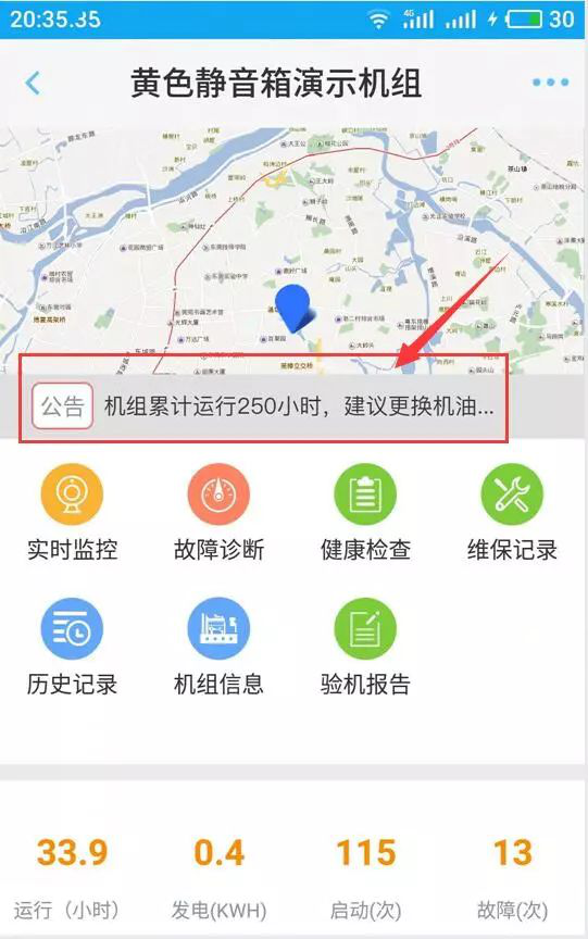 《p》买发电机这么久,什么时候该保养了? 《p》这次该保养要更换哪些配件,要多少费用? 《p》下一次维保又是什么时候,该保养什么? 《p》云控制器来帮忙!只要你安装了机组健康云APP,原厂会根据你的机组的运行情况,通过APP自动提醒你什么时候该保养什么,就像闹钟一样,到点提醒。 《p》