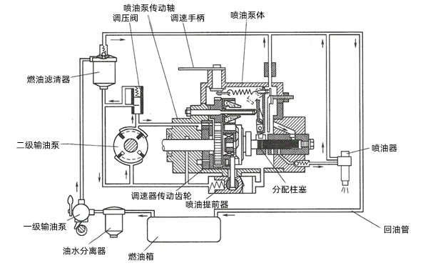 一级输油泵为膜片式泵,由配气机构的凸轮轴驱动。二级输油泵为滑片式泵,装在分配式喷油泵体内,并由分配式喷油泵的传动轴驱动。滑片式输油泵出口油压随其转速而增加,为控制喷油泵体内腔油压保持稳定,在二级输油泵出口处设有调压阀。当喷油泵体内腔油压超过规定值时,将有部分燃油经调压阀返回输油泵入口。喷油泵体内腔油压一般为(0.3~0.7)MPa。