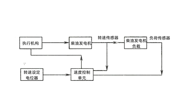 当柴油发电机在某一负荷下稳定运行时,其工作转速等于转速设定电位器的设定转速。转速传感器的输出电压作为负值信号在速度控制单元内与正值的设定转速电压信号相互抵消。速度控制单元往执行机构的控制电压信号使执行机构的输出轴静止不动,柴油发电机供油量固定,转速稳定。