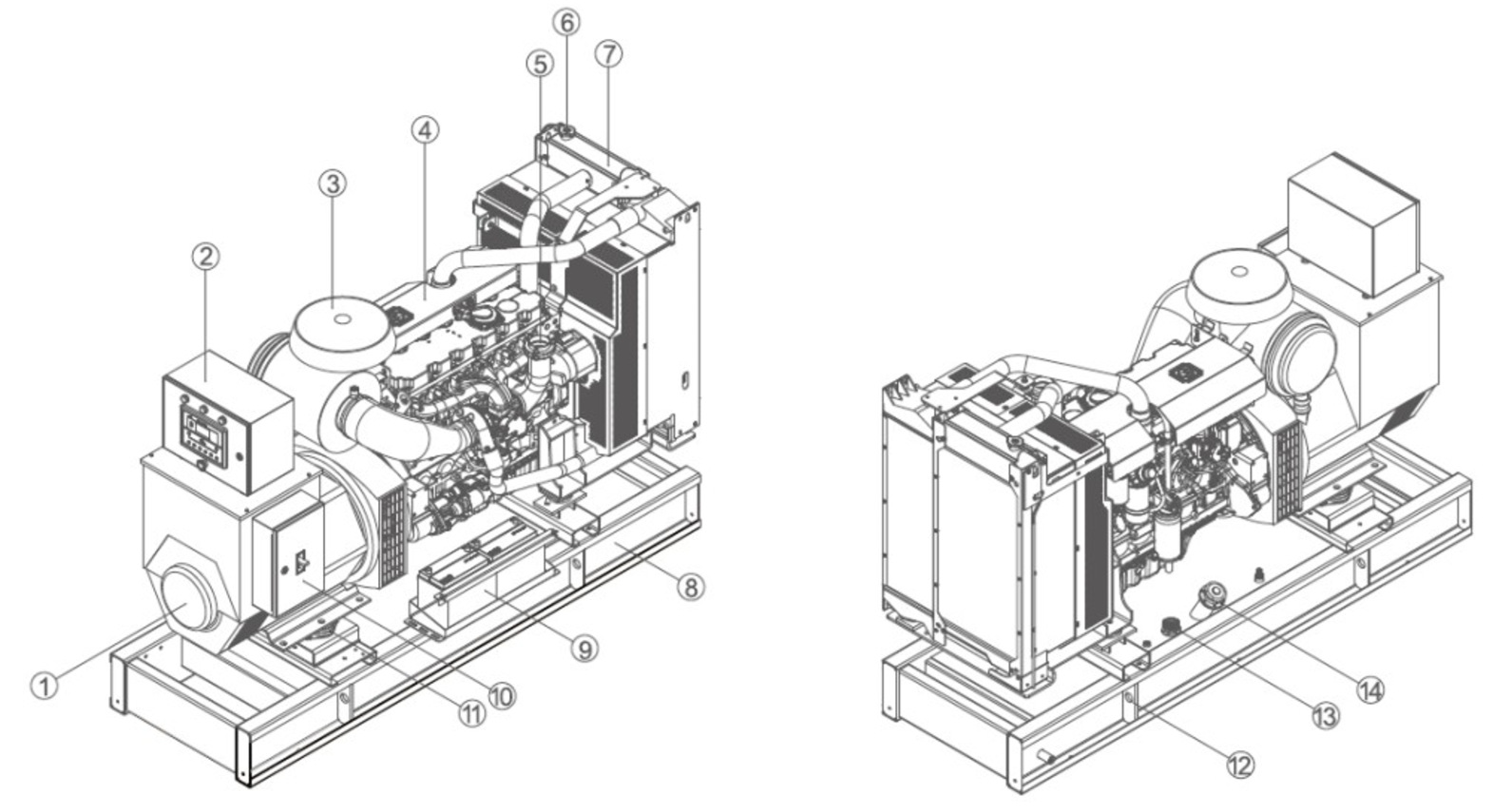 ①交流发电机 ②控制屏 ③空气滤清器 ④发动机 ⑤排气管安装法兰