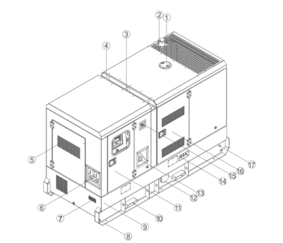 ①加冷却液口 ②废气 ③吊耳 ④绳口 ⑤进风口 ⑥快速连接口 ⑦出线槽 ⑧拖拉孔 ⑨底盘 ⑩叉车槽 11、控制屏 12、燃油排放口 13、加燃油口 14、外部油箱连接口、冷却液、机油排放口 15、急停开关 16、检修门 17、接地螺栓