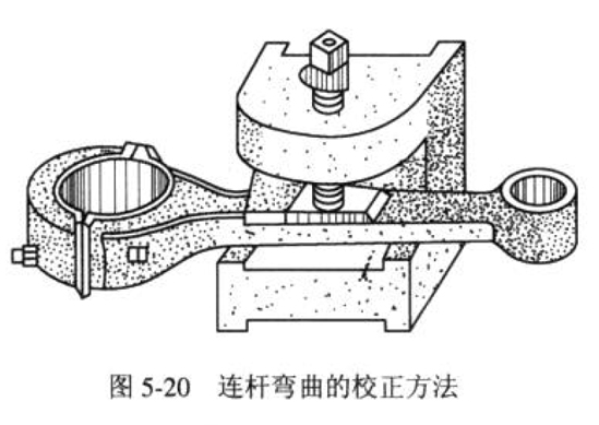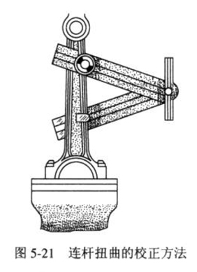 在检验连杆弯曲和扭曲度时,应在连杆上部做好标记,以用来观察弯曲和扭曲的方向,校正时,应先校正扭曲后再校正弯曲。连杆的校正一般使用专用工具进行。连杆弯曲的校正方法如图5-20所示。也可把连杆固定在虎钳上,再用长柄扳手、管子钳来校正。